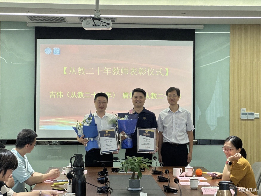 大会现场,“光荣从教二十年”颁奖仪式温情启幕,学院为吉伟老师、唐煜老师送上敬意与祝福。唐煜老师细数二十年从教感悟,“教育是人的事业,源于热爱,忠于初心,贵在坚守和奉献”“不仅要播撒创新的种子,更要培育'强国有我'的精神脊梁”,这些话语既凝聚着教育智慧,又饱含对教育事业的赤诚之心。面对年轻教师,唐煜老师送上沉甸甸的期许:要有守住“育人初心”的定力,不被浮躁裹挟;保持“求真治学”的韧劲,不向浅尝辄止妥协;常怀“以生为本”的温度,既要做 “经师”,更要做“人师”。这份叮嘱,是师德的传承,更是“未来”教育薪火的接力。