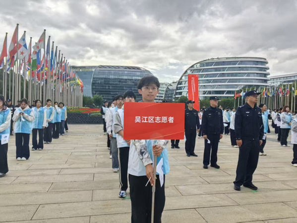 这13名“小叶子”来自苏州大学未来校区,由吴江区委社会工作部统筹招募,主要负责场馆外的交通引导、信息问询、秩序服务、应急救助等工作,分散在储光路与盈港东路交叉口处的多个服务点位。