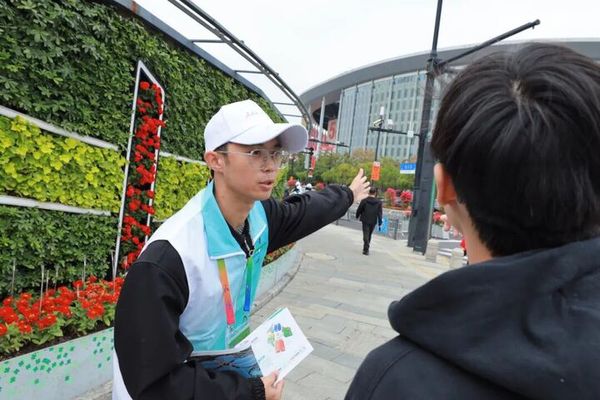 该路段毗邻展馆,人流密集,来自法国、德国、巴基斯坦、越南、马来西亚等国家的参会者络绎不绝。每当有人面露困惑,志愿者黄嘉文和队友们总是第一时间送上温暖的笑容与耐心的解答。
