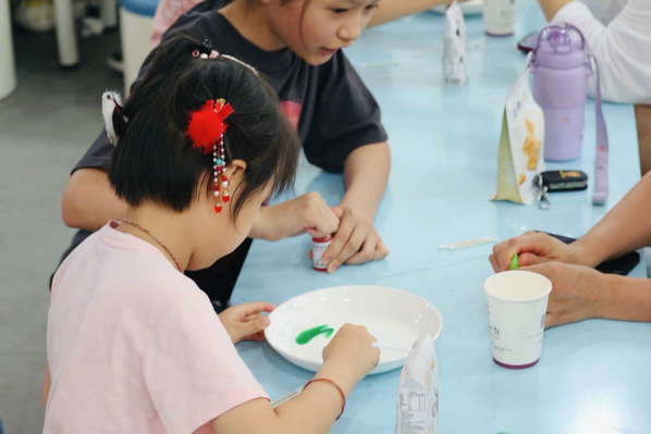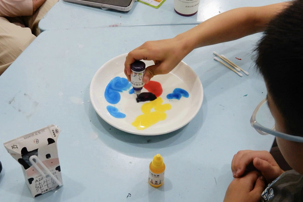 最后,活动以趣味颜色小实验——“七彩瀑布”收尾。当牛奶遇上颜料,再辅以洗洁精的魔法,一场关于表面张力的奇妙演出悄然上演。孩子们屏息凝视,只见色素在盘中缓缓流淌,构成一幅幅动人心魄的画面。这个实验不仅加深了孩子们对颜色的感知力,还让孩子们意识到科学与物理的魅力,为他们科学素养的发展埋下一粒小小的种子。