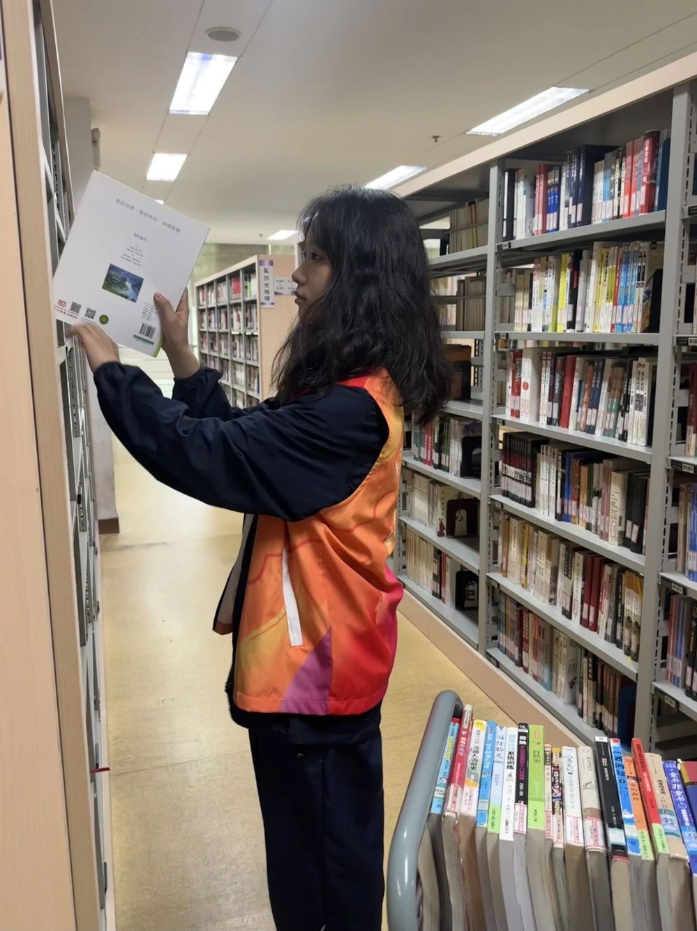 一部分成员在旁边的借阅室,将读者在网上借阅的书籍进行包装、标号、登记。还有一部分成员在楼上的藏书馆,在工作人员的指导下,将刚到的新书按照顺序放在书架中。志愿者们高效地完成任务,为图书馆的读者提供了一个整洁、井然有序的阅读环境。