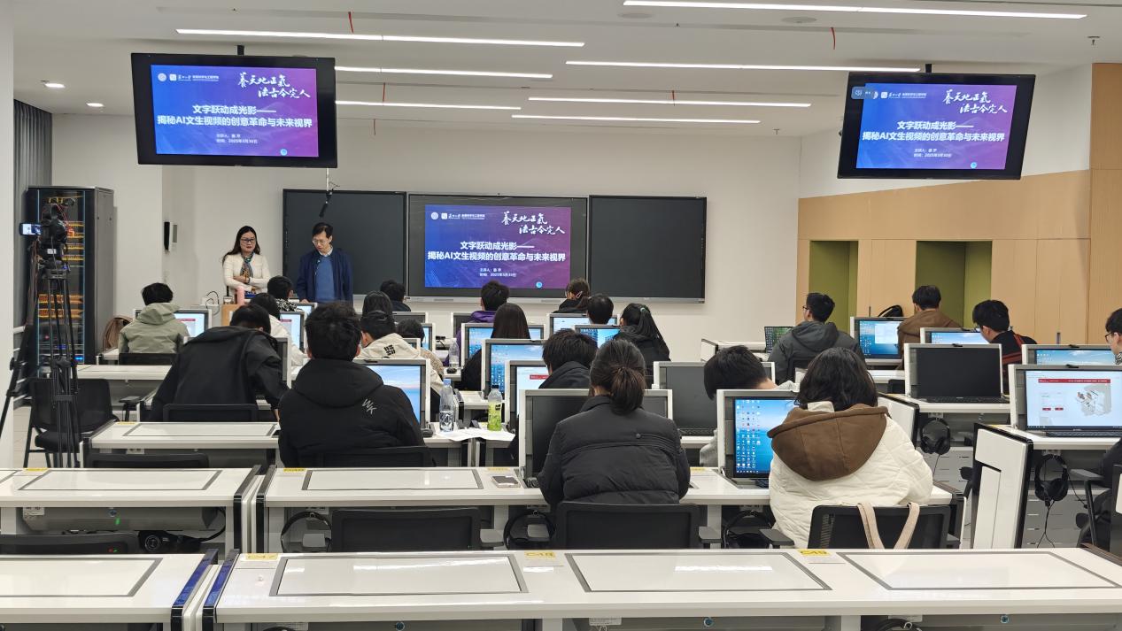 姜芹老师作《文字跃动成光影:揭秘AI文生视频的创意革命与未来视界》主题分享。姜老师解析了AI工具实现文生视频的核心逻辑,是从语义解析到视觉映射最后进行动态合成。随后,姜老师还介绍了各类AI工具及其独特的场景适配性,例如,即梦AI擅长自然风光,通义万相AI专注东方美学,可灵AI适合生活记录。在分享的最后,姜老师贴心地为创作新手们指出了在使用AI工具时容易陷入的三大典型误区:一是文字抽象无细节;二是忽视音效的力量;三是平台适配性缺失。姜老师的提醒,无疑为学生们在利用AI工具创作时避开了很多弯路。
