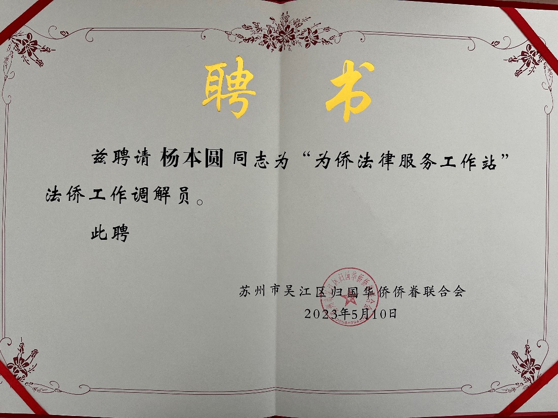 揭牌仪式后,未来科学与工程学院教师杨本圆受聘成为吴江法侨工作调解员。杨本圆老师表示,很荣幸成为一名法侨工作调解员,深知使命在肩、责任重大,在今后的工作中,会强化责任意识,知责于心、担责于身、履责于行,努力发挥高校教师在人才和创新方面的优势,与侨联同仁们通力配合、携手并进,为涉侨工作添砖加瓦,以实际行动践行初心使命。