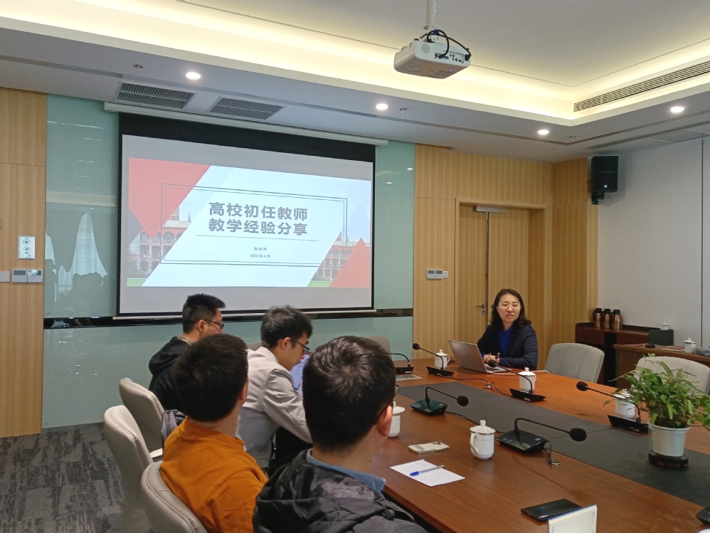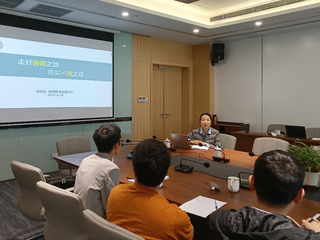 陈书洋老师介绍了学校支持教师发展的各类政策举措和教师教学发展中心的工作情况,阐释了高校教师从新手到专家各个阶段的专业发展路径以及教师在各个阶段应具备的各类专业能力,并从专业建设类、课程建设类、课程思政类、教学团队类等方面介绍了各类赛事及其成果榜单,鼓励学院初任教师积极参与,共同努力推进教育教学改革创新。