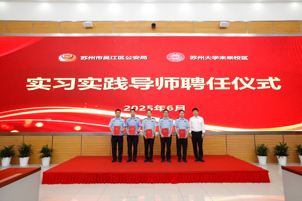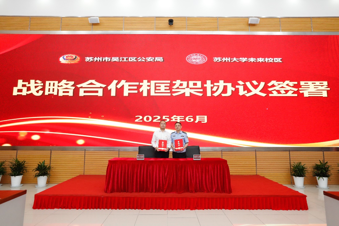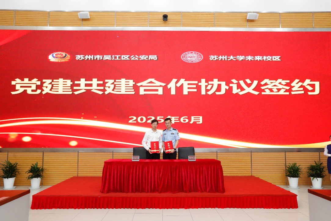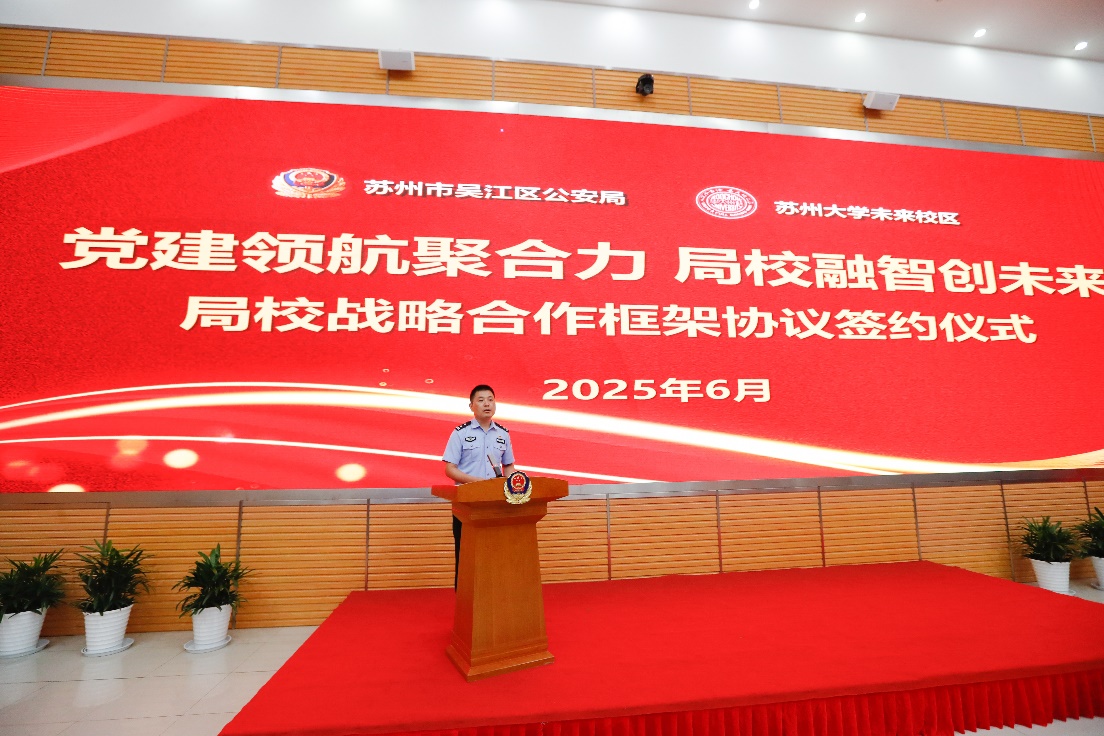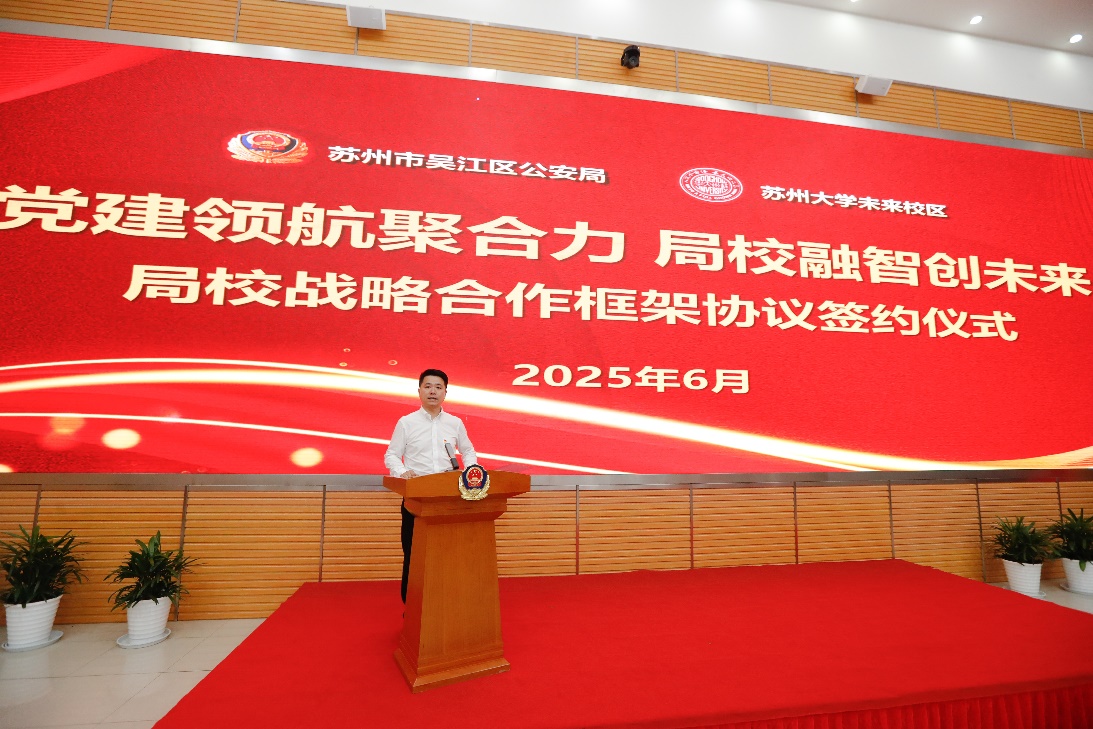 为深入学习贯彻习近平新时代中国特色社会主义思想,认真落实习近平总书记关于“加强人工智能同社会治理的结合”重要指示精神,强化党建引领、科技赋能与社会治理深度融合,6月13日上午,苏州大学未来校区与吴江区公安局举行“党建领航聚合力 局校融智创未来”战略合作共建活动。吴江区副区长、区公安局党委书记、局长郁海成,区公安局党委副书记、政委朱学军,区公安局党委委员、政治处主任蒋峰,区公安局副局长徐文婷,区公安局党委委员、情报指挥中心主任俞洪峰,校未来校区管委会主任、未来科学与工程学院党委书记吉伟,吴江区政府党组成员、科技镇长团团长、校未来校区管委会副主任刘超,校学科建设与发展规划处处长、未来科学与工程学院常务副院长陈涛,未来科学与工程学院党委副书记、副院长陈贝贝,副院长、综合党支部书记王进,吴江区公安局相关部门负责人及学院党员代表出席活动。