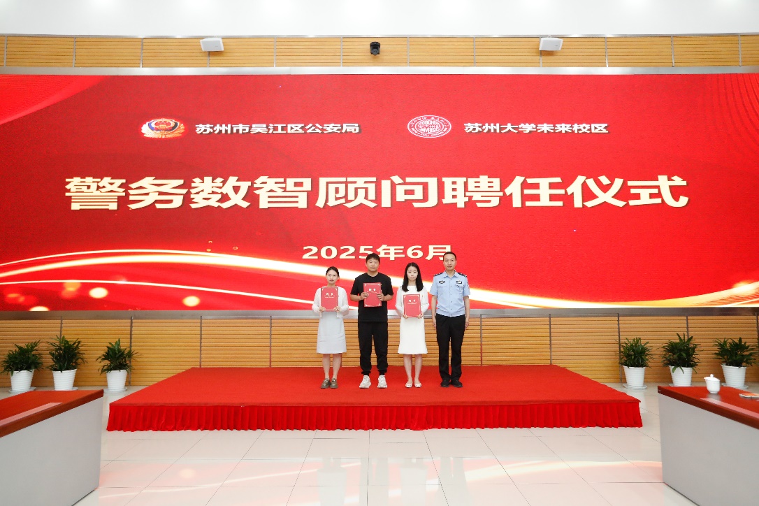 签约仪式上,刘超和朱学军共同签署《吴江区公安局与苏大未来校区战略合作框架协议》。基于此框架,王进和吴江区公安局大数据建设应用大队大队长、党支部书记汪兵舰签署《党建共建合作协议》,双方将通过组织联建、人才共育、科研攻坚、安全融通等举措,积极探索“校警协同共进共治、智慧赋能社会治理”的新模式新路径。活动同步启动了首批共4项“AI赋能智慧治理”项目,俞洪峰为学院三位人工智能领域教师、项目负责人颁发警务“数智”顾问聘书。