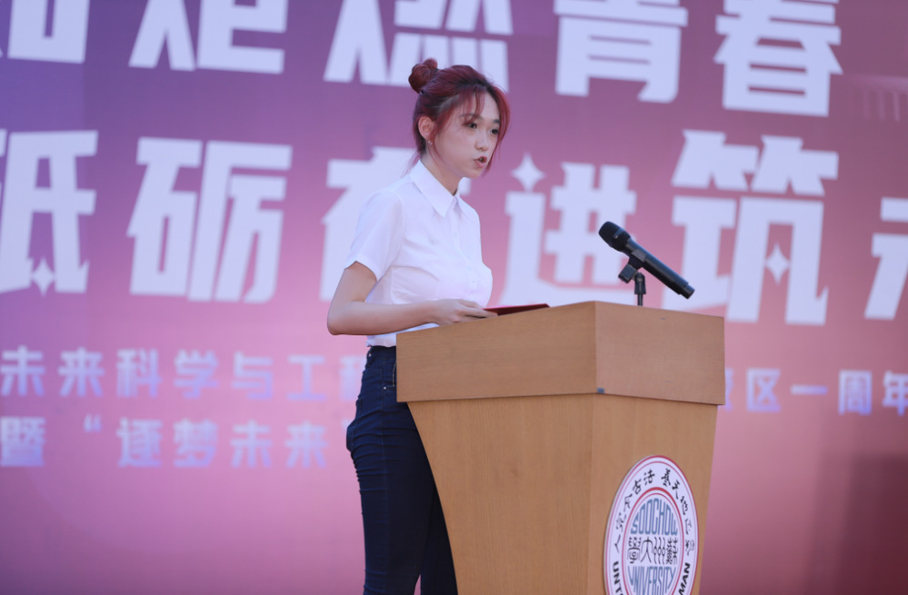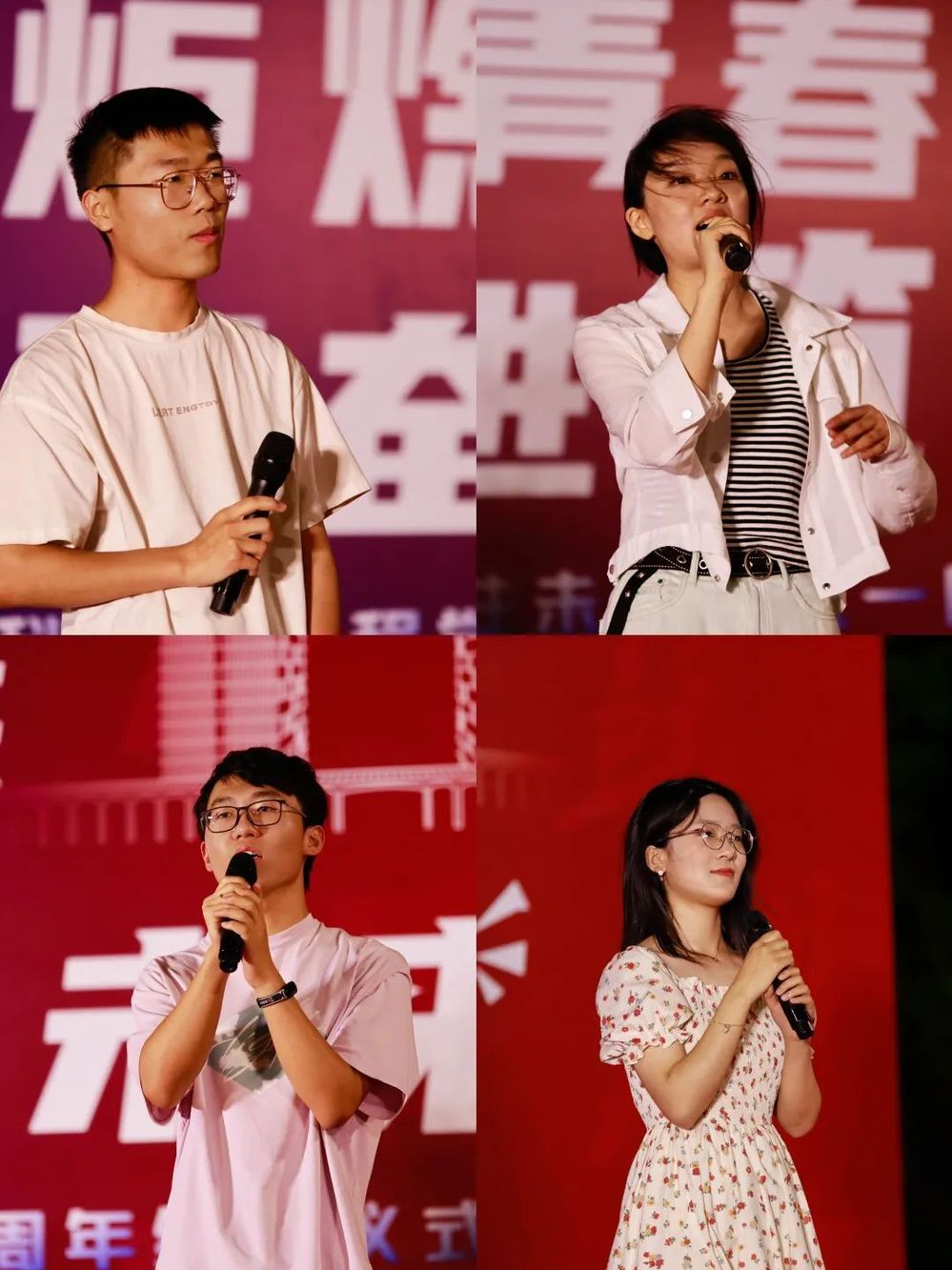 纪念仪式上,21级统计2班张文婧作为学生代表发言,她回忆了一年以来在校区学习的点点滴滴,并与大家约定:愿我们披着星光,从不懈怠,永远心怀期待;愿我们穿越山海,续写热爱,激荡青春时代,将一切不确定都变成确定、肯定以及一定!