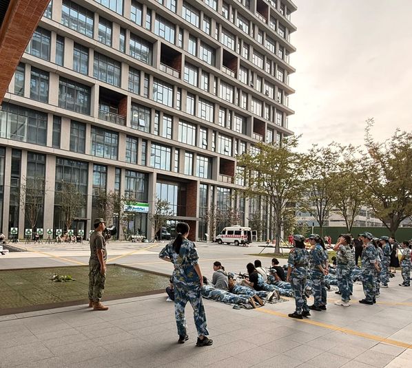 训练场外,另有一道暖心风景。辅导员全程陪伴,志愿者奔波忙碌,服务驿站化身“能量补给港”。饮用水药品随时取用,关怀问候无微不至。他们用默默付出诠释着“硬核”守护,让艰苦训练亦有温暖底色。