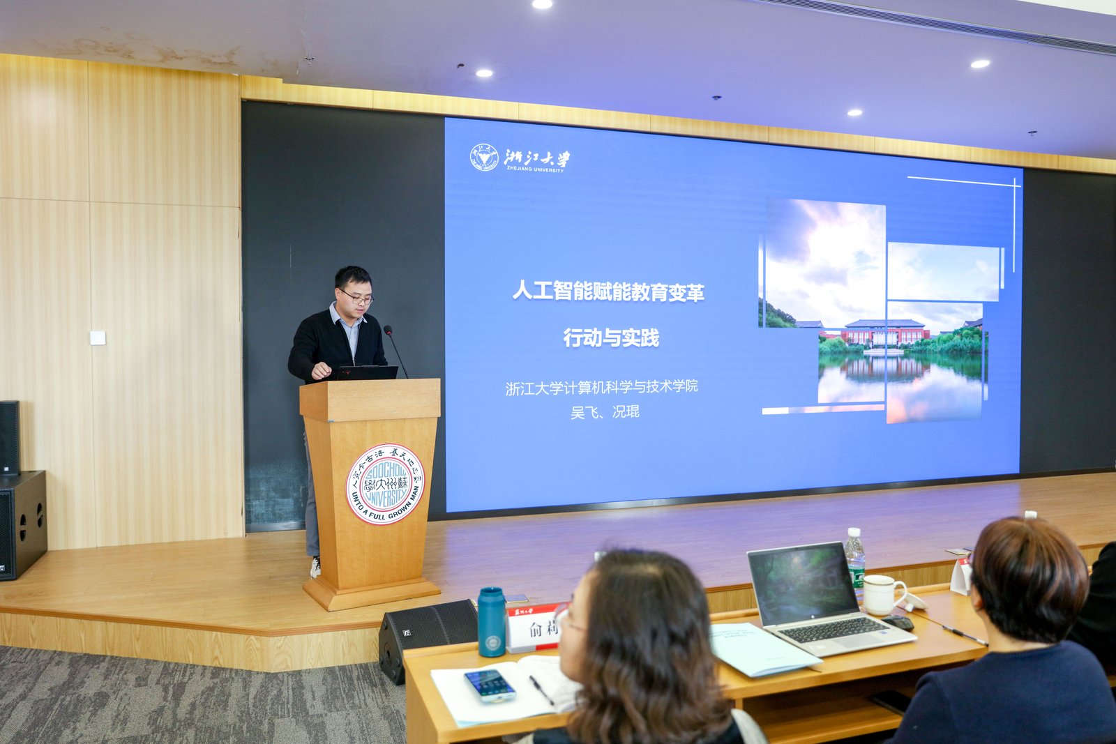 随后,来自浙江大学的况琨教授作《人工智能赋能教育变革:行动与实践》报告。况教授详细阐述了人工智能技术在教育领域的应用现状及其未来发展趋势,强调了人工智能技术对教育变革的推动作用,并分享了他在这一领域的研究成果和实践经验。