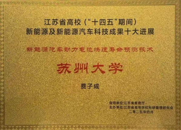 近期,江苏教育界与产业界对话对接活动——“双高协同·四链融合”新能源及新能源汽车高质量发展大会在盐城召开,会上发布了《江苏省高校新能源产业“十四五”重大科技成果》,我院费子成老师团队的科研成果“新能源汽车动力电池快速寿命预测技术”入选“江苏省高校(“十四五”期间)新能源及新能源汽车科技成果十大进展”。