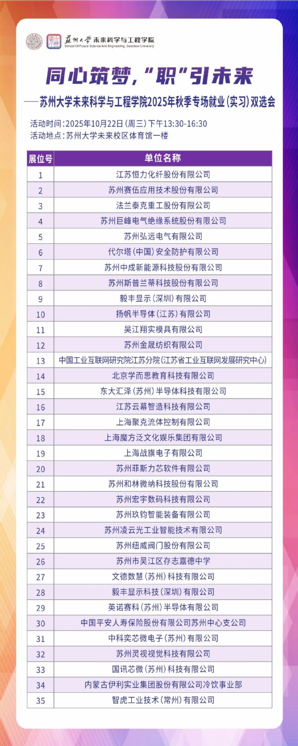 苏州大学未来科学与工程学院“同心筑梦,‘职’引未来”2025年秋季专场就业(实习)双选会将于2025年10月22日(周三)13:30-16:30在苏州大学未来校区体育馆一楼举行,本次招聘会参会单位35家,提供岗位超170个,招聘人数1400+人。