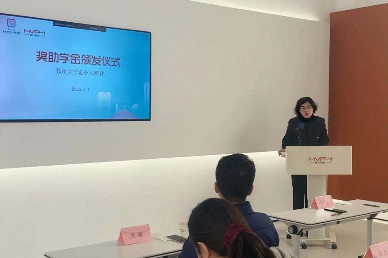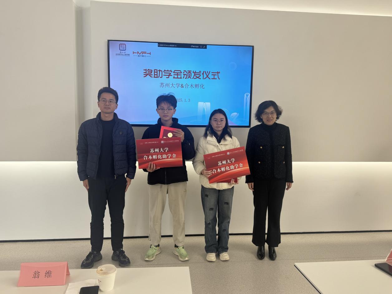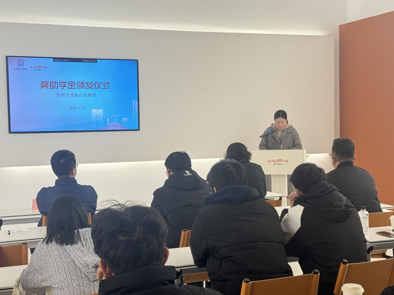 1月3日,苏州大学合木孵化奖助学金颁奖仪式在合木·传奇大厦成功举办。苏州合木孵化管理有限公司创始人翁维、联合创始人陈玮勇,未来科学与工程学院党委副书记、副院长陈贝贝,教师代表,获奖学生代表出席仪式,颁奖仪式由苏州合木孵化管理有限公司周齐主持。