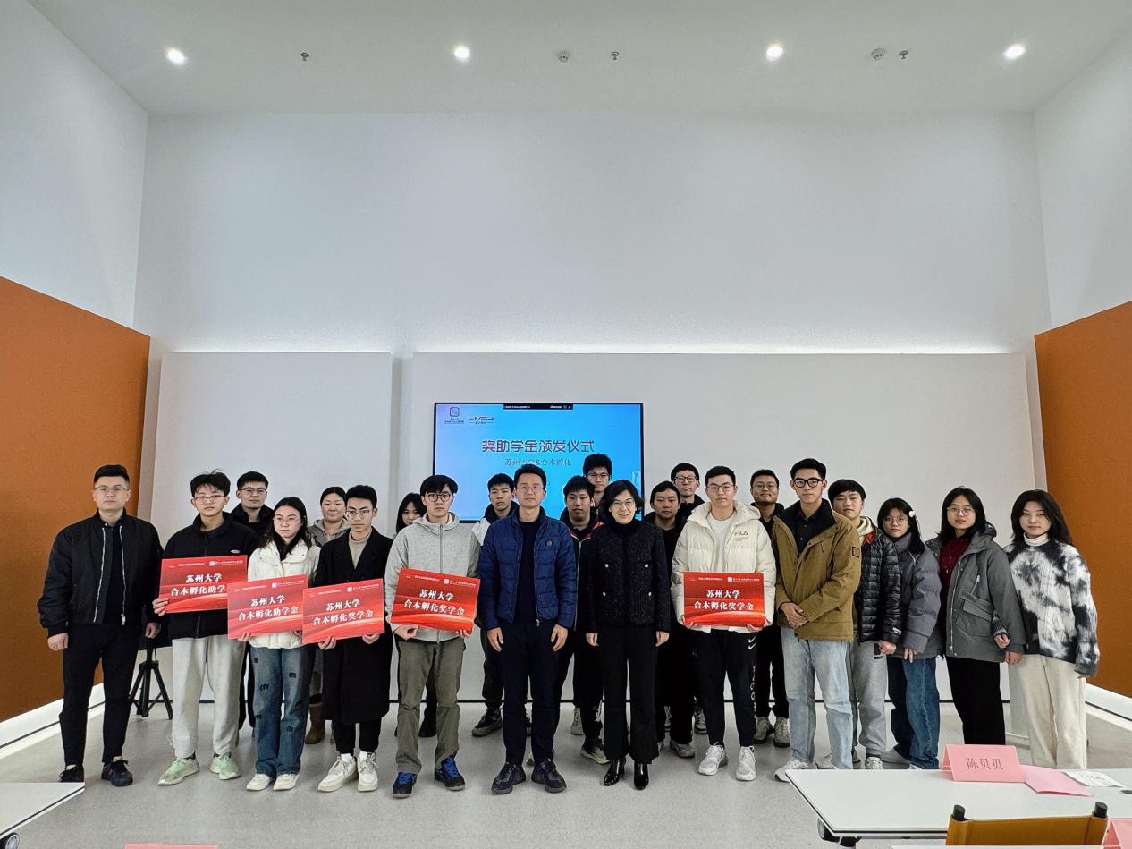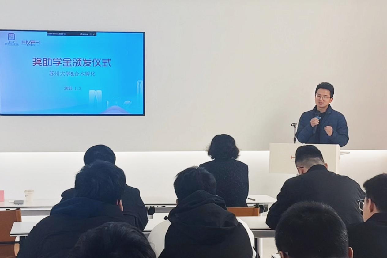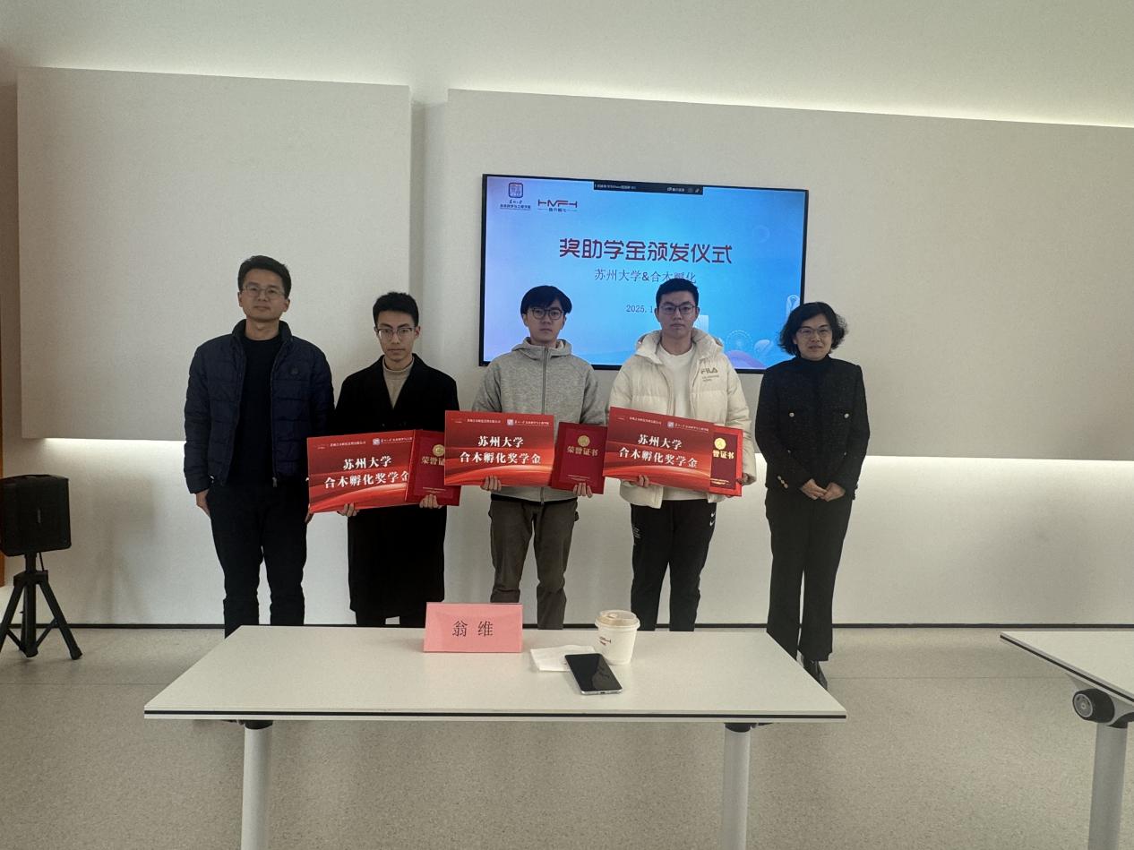 1月3日,苏州大学合木孵化奖助学金颁奖仪式在合木·传奇大厦成功举办。苏州合木孵化管理有限公司创始人翁维、联合创始人陈玮勇,未来科学与工程学院党委副书记、副院长陈贝贝,教师代表,获奖学生代表出席仪式,颁奖仪式由苏州合木孵化管理有限公司周齐主持。