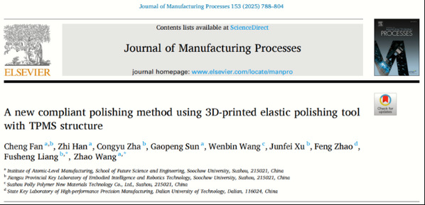 近日,我院樊成教授团队与苏州博理新材料科技有限公司展开深度合作,将企业探索3D打印应用的需求转化为科研切入点,协同攻关成功开发出基于TPMS(三周期极小曲面)结构的3D打印弹性体抛光头,将K9玻璃初始粗糙度从2±0.05μm降至5.531nm,实现“纳米级”光滑突破。该研究成果已发表于制造领域国际权威期刊《Journal of Manufacturing Processes》。