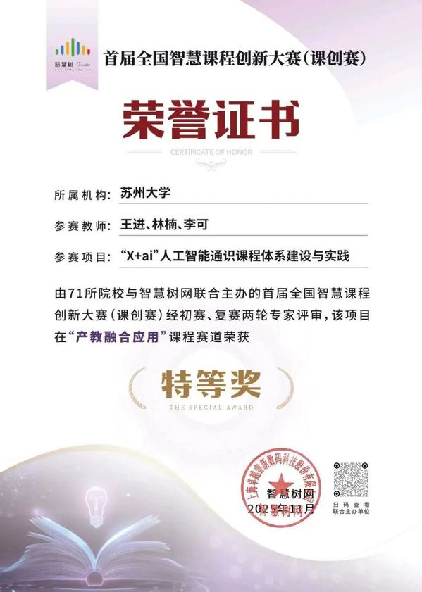 近日,在首届“智慧树杯”全国智慧课程创新大赛(课创赛)中,苏州大学未来科学与工程学院王进教授牵头与世纪互联集团、中关村超互联新基建产业创新联盟(以下简称“中关村超互联联盟”)合作开设的《“X+ai”人工智能基础》通识课程荣获特等奖。这一成绩不仅是对学院团队教学创新能力的充分认可,更是我院践行“面向未来、交叉融合、产教协同”育人理念的生动实践。