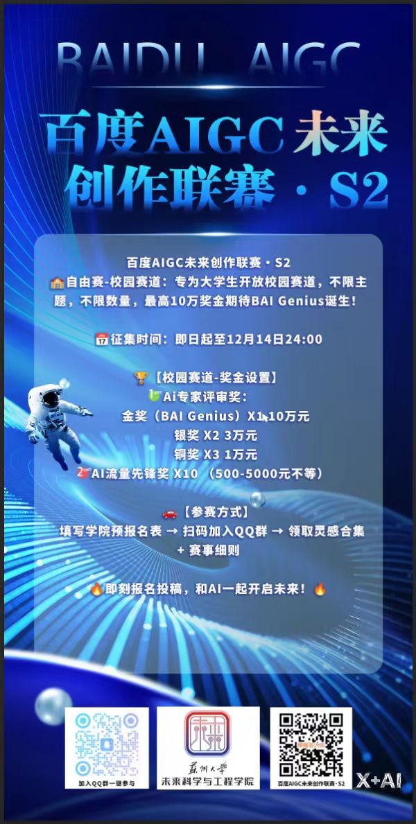 学院自2024年10月起与世纪互联、超互联联盟深化校企协同,构建起“课程—平台—基金—赛事”一体化的“X+ai”育人生态。通过规划建设苏州大学“X+ai”创新港,学院引入百度、WaytoAGI等行业领军力量,为学生提供坚实底座,真正实现从知识学习到价值创造的跨越。