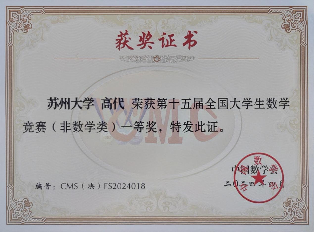 4月19日至4月21日,由中国数学会主办的第十五届全国大学生数学竞赛决赛在山东大学举行。未来科学与工程学院人工智能专业本科生高代同学斩获全国大学生数学竞赛(非数学类)决赛一等奖,这是我院学子首次入围全国决赛并取得最高奖!
