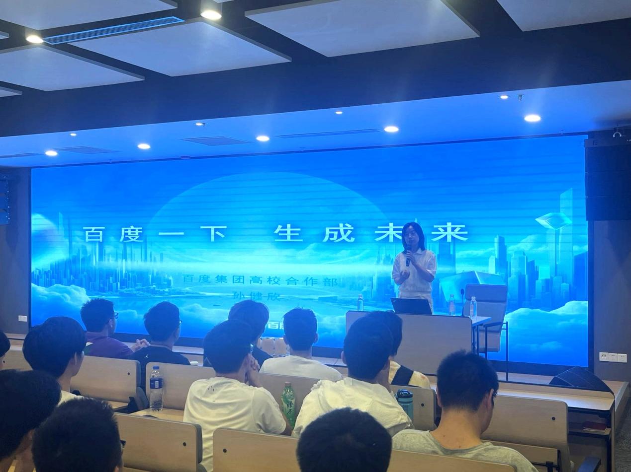 随后,百度公司孙健欣向同学们介绍了百度AI原生应用,以及苏州大学—百度 AI创新人才培养菁英班的开设理念。强调了同学们参加菁英班的注意事项,以及菁英班的三大组成板块:课程教学、实践教学和竞赛培训。在课程教学方面,百度公司提供包括人工智能相关的教学资源包和职场规划线上线下课程等;在实践教学方面,将提供实践基地以及题库练习;在竞赛培训方面,将组织学生参加由百度公司组织的各项大赛和暑期训练营活动。同时,就菁英班的选拔条件、课程内容等方面的问题与现场同学进行了热烈的互动,激发了同学们参与菁英班的热情。