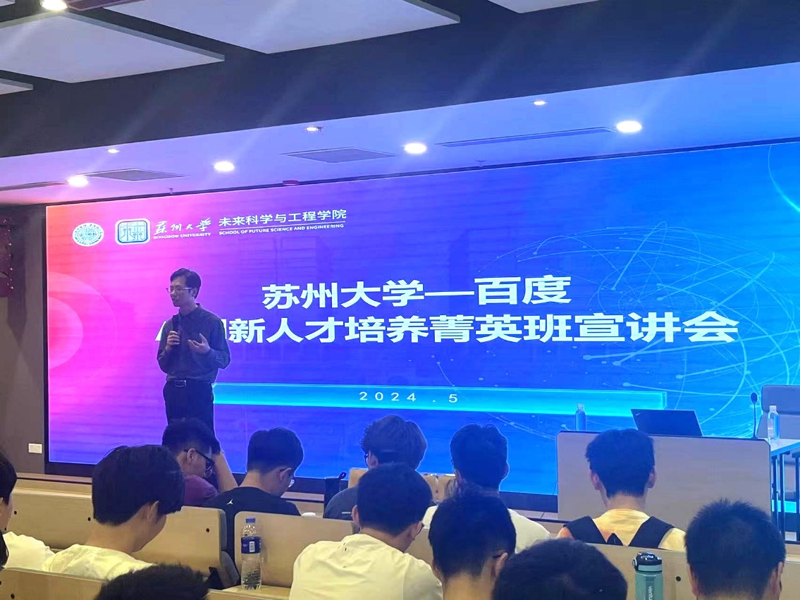 2024年5月9日,苏州大学未来科学与工程学院联合百度公司,面向学院学生组织开展苏州大学—百度 AI创新人才培养菁英班宣讲会。苏州大学未来科学与工程学院副院长王进,百度公司高校合作部孙健欣,班主任袁亚超、罗妍出席了本次宣讲会,会议由王进副院长主持。