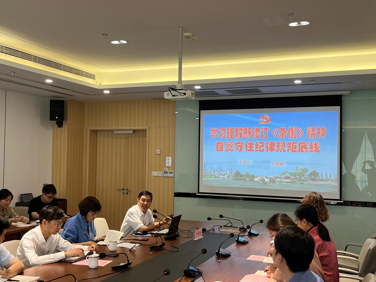 王冠豪以《学习理解新修订〈条例〉精神 自觉守住纪律规矩底线》为题,分别从《条例》修订的背景和重要意义,《条例》修订的主要内容和特点,抓好《条例》贯彻执行以及明纪守纪融入日常等四个方面,结合大量案例和本人纪检监察工作体会,对《条例》进行了全面系统、深刻生动地解读。王老师的辅导报告主题鲜明、视野开阔、逻辑严谨,既有政治高度,又有理论深度,还有实践思考,对进一步学习领会《条例》,切实把“六项纪律”内化于心、外化于行具有重要的指导作用。